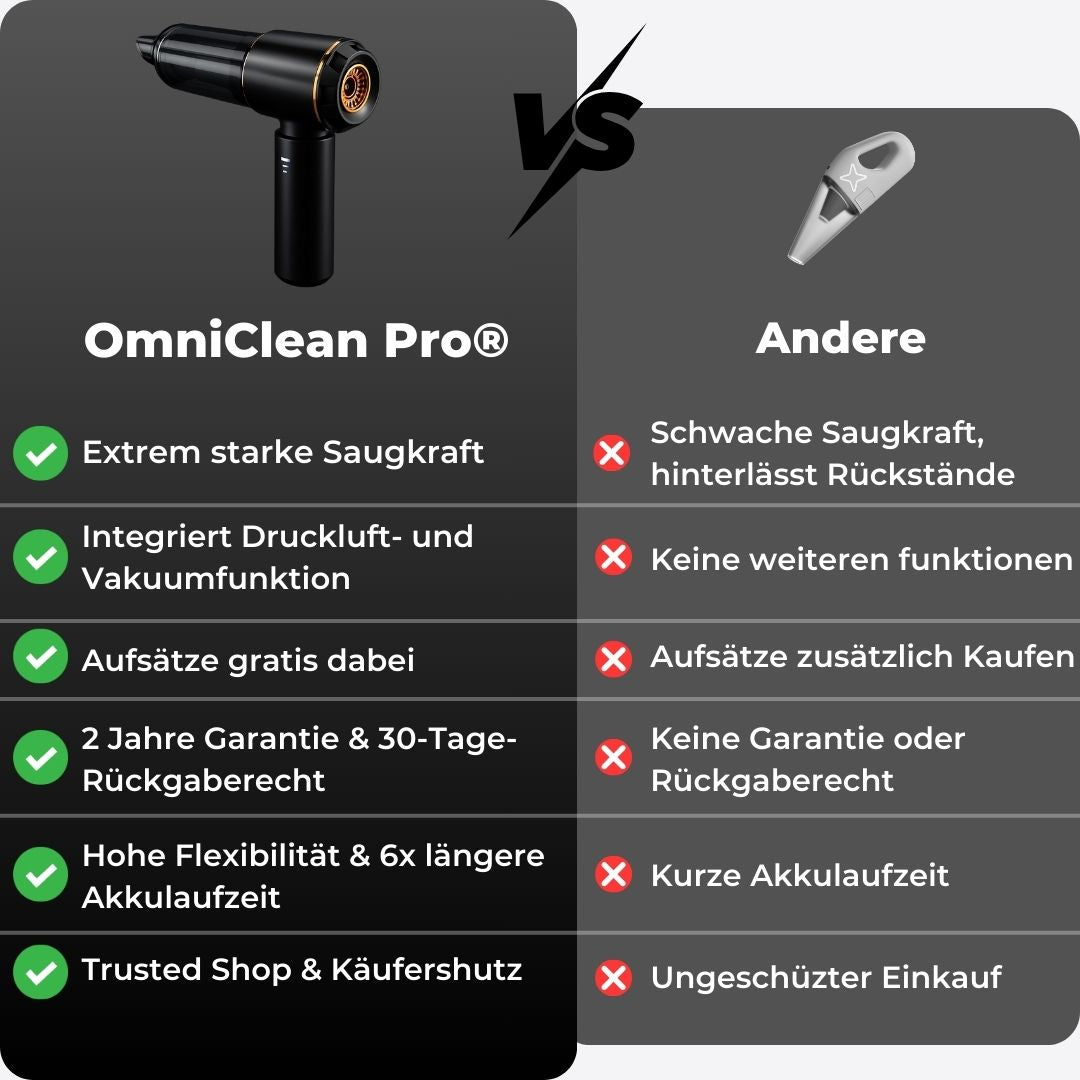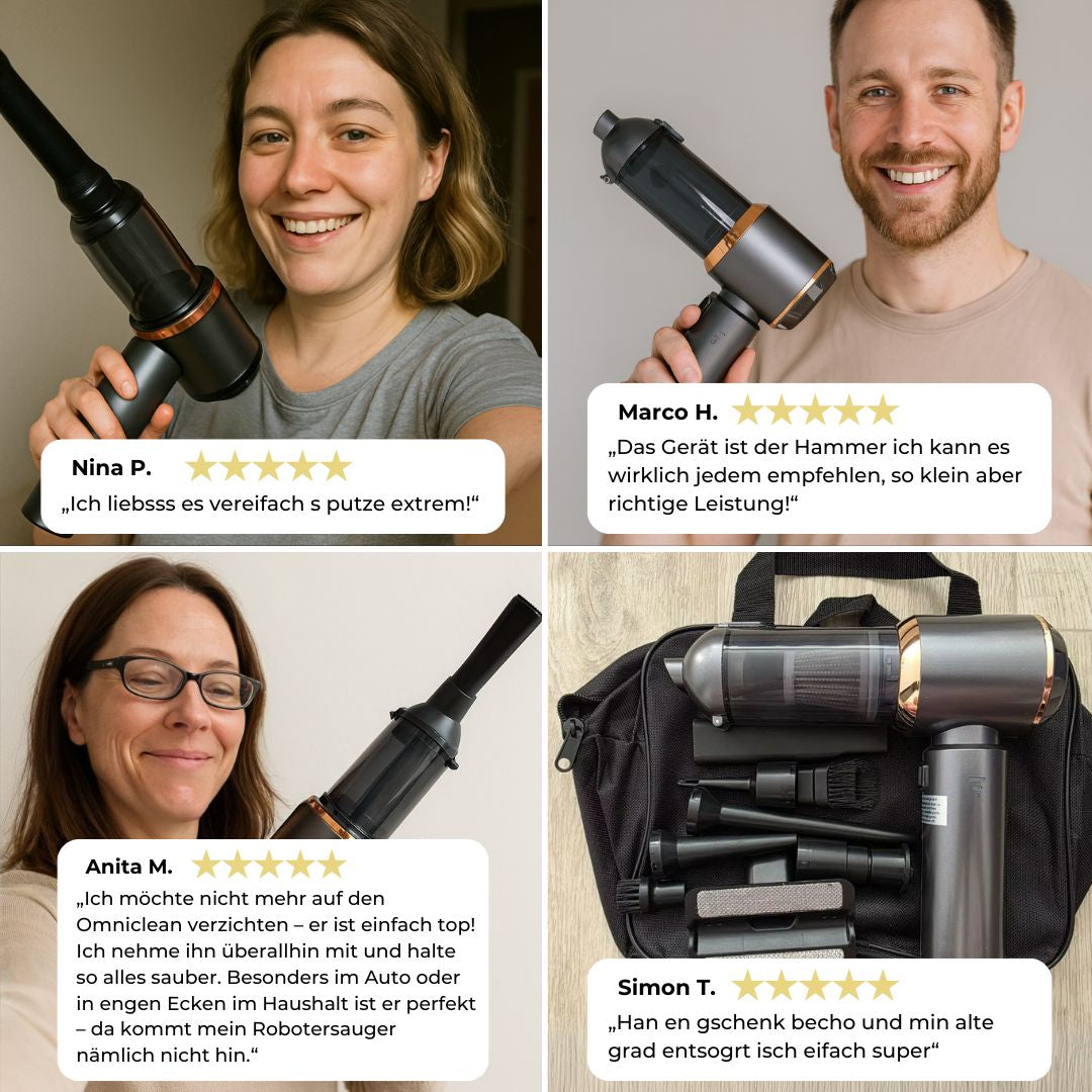 Vergiss umständliches Putzen. Der OmniClean Pro® macht Sauberkeit zum Kinderspiel – egal ob im Auto, auf dem Sofa oder im Büro.